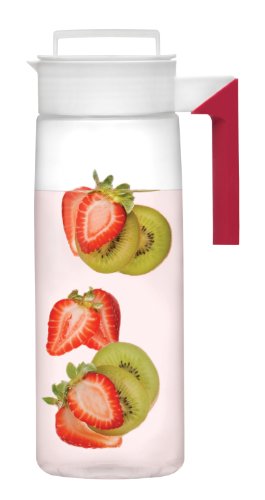 Perfect for mixing fruit with water or juice, as well as serving and storing your cold or hot beverages, this Takeya Fruit Infusion Jug features a fresh design that is tall and slender with a clear AcraGlass body that is BPA-free, as well as stain and odor proof. AcraGlass is lightweight and features glass-like clarity, yet is more durable than glass. The airtight twist-top lid features a built-in fruit blocker screen that suspends fruit while pouring, and locks in freshness. The soft grip handle allows for easy pouring or transporting, and features a beautiful raspberry color, a perfect accent to the white lid. This jug is designed to fit in the door of the fridge, or can be stored on its side with the lid on tight. Holds 66 ounces.
